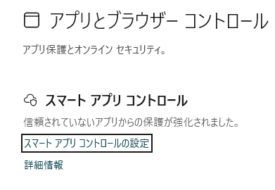 次に表示される画面で「スマートアプリコントロールの設定」をクリックすると、機能のオン・オフを切り替える画面が表示されます。