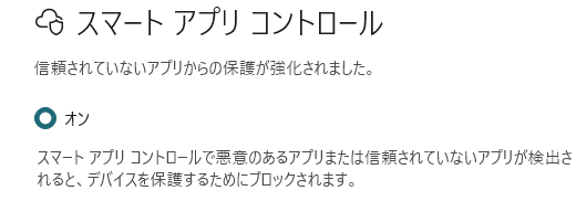 ここで「オン」を選択すると、スマートアプリコントロールが有効になります。