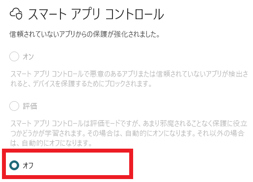 これでスマートアプリコントロール機能をオフにすることができました。