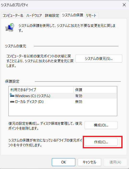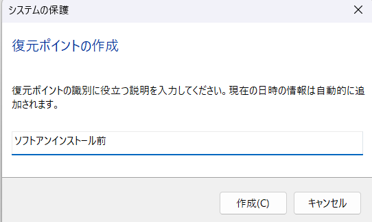 復元ポイントの作成手順