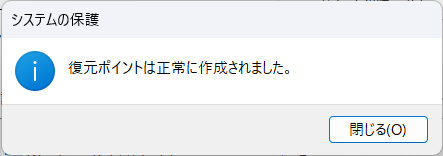 復元ポイントの作成が完了しました。